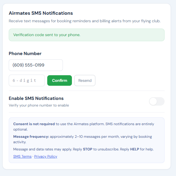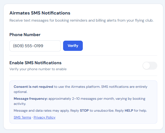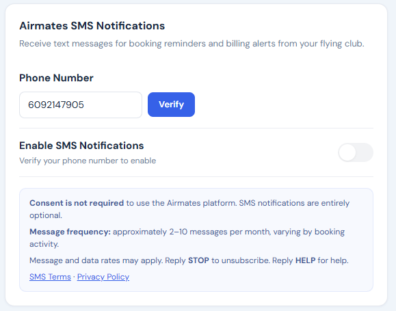 Members must complete phone verification before SMS can be enabled. No text messages are sent until the member has verified their number and explicitly turned on the SMS toggle. Consent to receive SMS is not required to use the Airmates platform and is not a condition of purchase of any service.